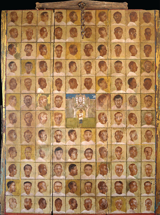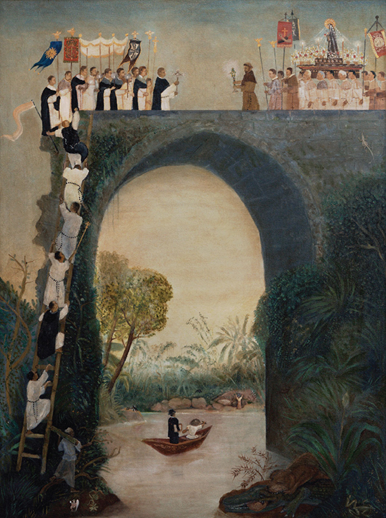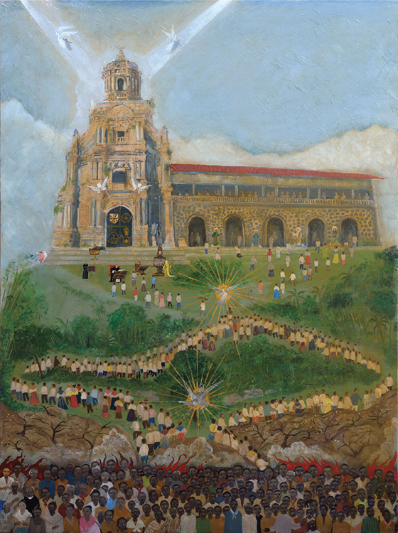 The historic church of San Jeronimo in Morong built by the Franciscans in the 17th century represents the gateway to Heaven in this HOCUS painting. Filipino natives are seen milling around the esplanade of this imposing Church; the ecclesiastical symbols of the major religious orders are emblazoned on its portal, each represented by a friar, seated in front, preoccupied with a census dramatically called the Libro de Almas (Book of Souls), containing the names of”enrolled souls’: