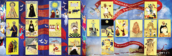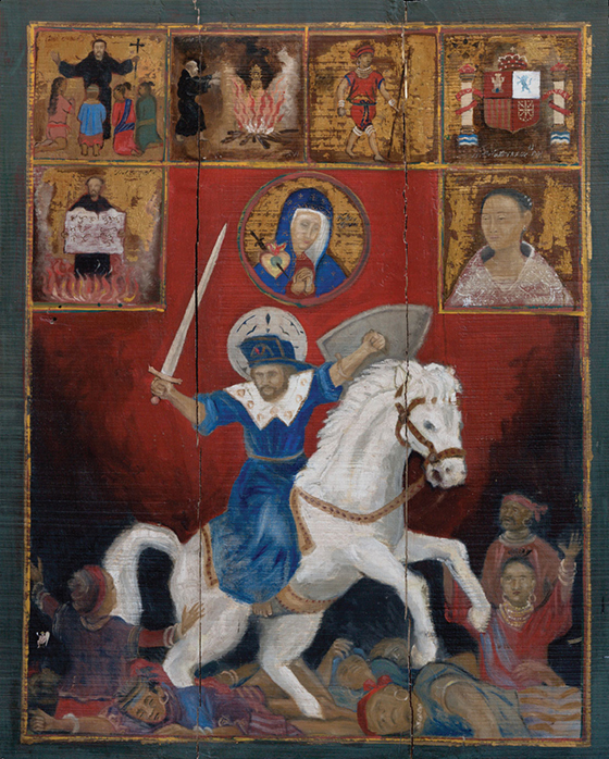 The central figure in this HOCUS painting is Santiago Matamoros as he is portrayed in many colonial paintings and moro-moro dramas in the Philippines. He is surrounded with vignettes depicting Christianization-a priest burning a native god and a friar holding up a manuscript written in baybayin script. Indigenous communities in Palawan, Mindoro and Bohol still use a native syllabary up to this day.