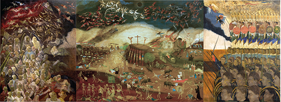 This HOCUS triptych depicts Good and Evil locked in a fierce and perpetual battle for hegemonyover the Earth and its creatures. Take your time to unravel each image, nightmares in my mind, which I have explained to Guy Custodio with a proliferation of details. I see death in various forms: “mga araw na walang Diyos” (days with no God), post-Golgotha and pre-Resurrection. There were demonic times in the country’s history during which Filipinos feared that there was no God.