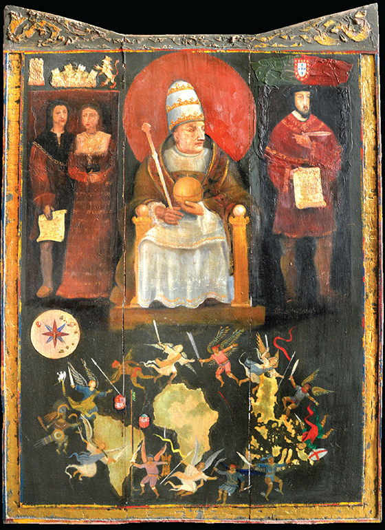 The divided world is shown in the painting with Spanish and Portuguese angels and indigeneous angels of the conquered territories armed with their native weapons, fighting over the territory divided by the Catholic Pope.