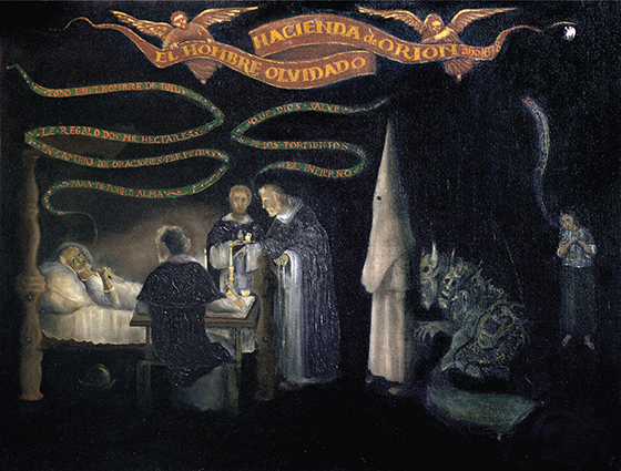With his last breath, the moribund former conquistador implores the Dominican friars: “Todo en el nombre de Dios, les regalo dos mil hectareas en cambio de oraciones perpetuas para mi pobre alma” (All in the name of God, I give you 2,000 hectares in exchange for perpetual prayers for my poor soul.) As a friar administers the sacrament of Extreme Unction, a scribe dutifully records the man’s last will and testament.