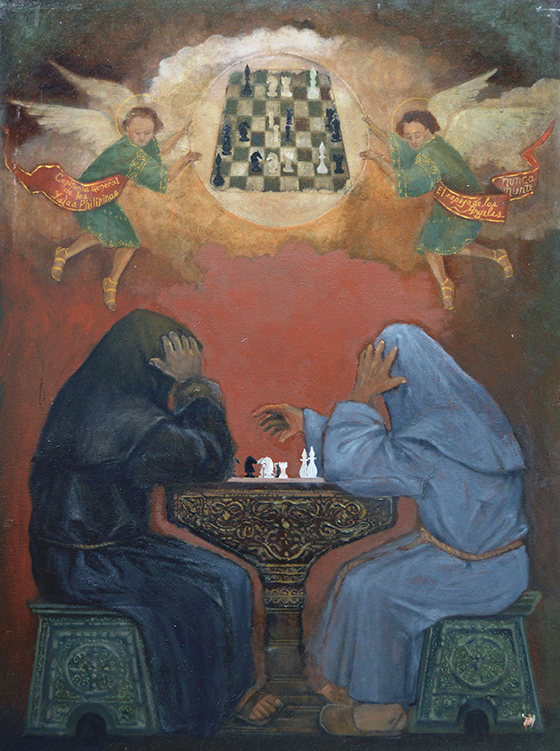Two celestial chess players are deeply engaged in their game while angels bearing a mirror reflect the crucial position of the pieces on the chessboard.