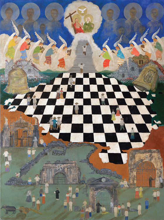 The indio’s sufferings on earth are rewarded by eternal life. Eternal life doing what the doctrine adequately fails to explain. Perhaps he will be rewarded the right to play music for the heavenly Father, as the angels above seem to suggest. The right to pass the gates to Heaven are controlled by the Holy Orders. Although the fences seem inutile and the locked gates useless since the indio could easily surmount the brick fences and cross the checkered board of night and days towards the stairs leading to heaven. But who is the indio to question established dogma?