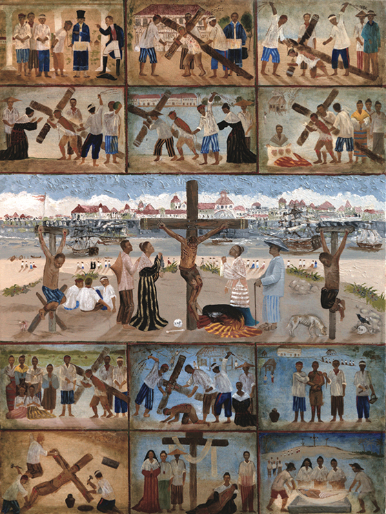 Inspired by historian Rey Ileto’s monumental Pasyon and Revolution, this HOCUS painting attempts to show how the Filipino masses translated the Passion and Death of Jesus Christ into their own existence, struggle and redemption during Spanish colonial times. Jesus Christ suffered at the hands of his fellow Jews who scourged Him mercilessly, dragged Him to Calvary where He was crucified on the cross, between two thieves. In the Philippine colonial scene, according to Dr. Ileto, “the pasyon made available a language for venting ill-feelings against oppressive friars, principalia and agents of the State’