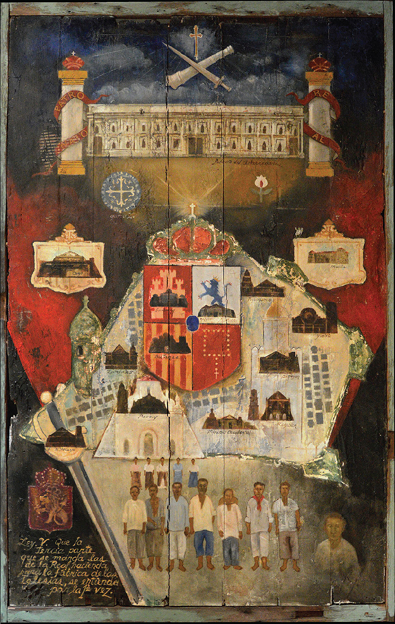 The churches of Panay, Zambales, Nueva Vizcaya, Cuyo, Misamis Occidental, Tuguegarao, Isabela, Cagayan, Paoay and Romblon also emblazon the schematics of Intramuros, emphasizing the control of the State in the propagation of the Faith. Words from the law reserving a portion of the income of the State towards the building of churches are quoted on the left corner of the painting.